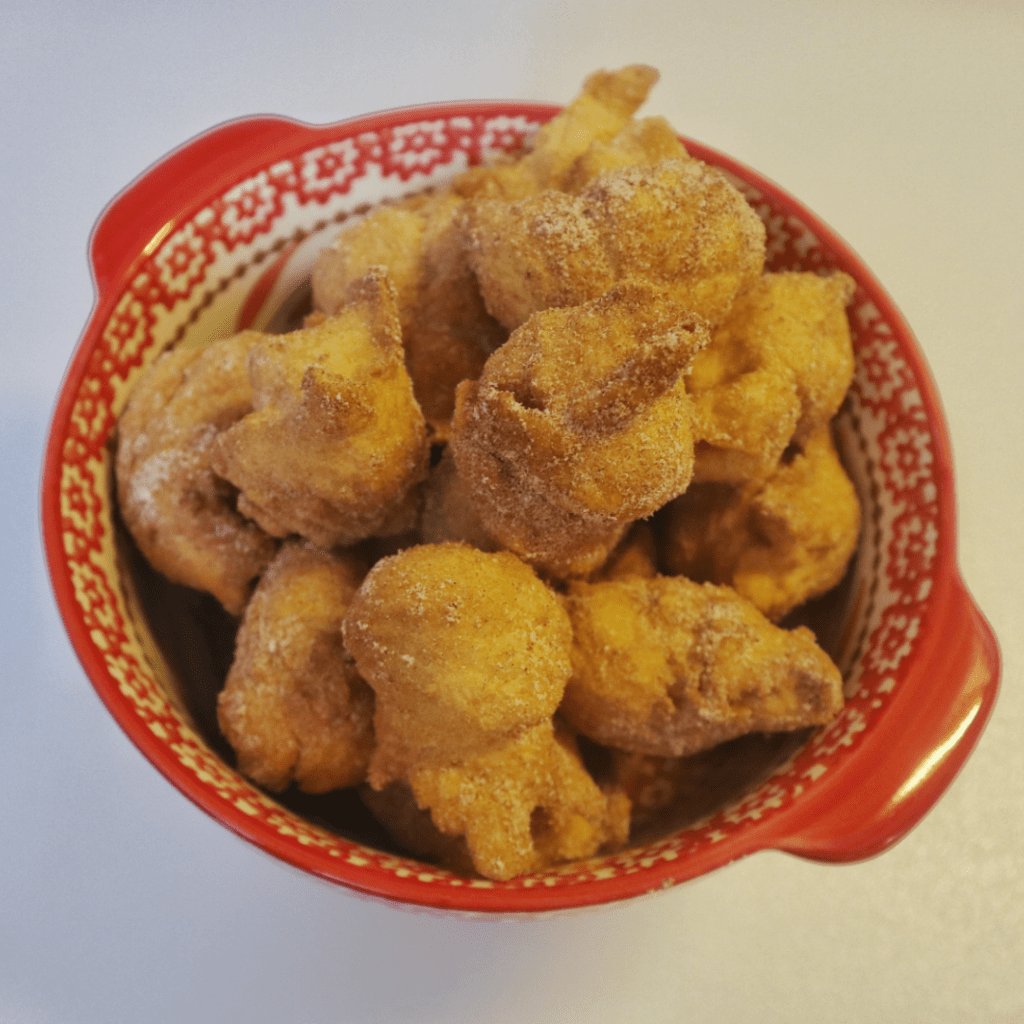 - Heat the oil to 375* and using a small scoop, scoop out the dough and carefully place in the hot oil. Cook until golden and cooked through. Turn the donuts to ensure even browning on all sides. Remove and place on a paper towel lined plate to drain. Roll in the cinnamon sugar and place on a tray or bowl to serve.