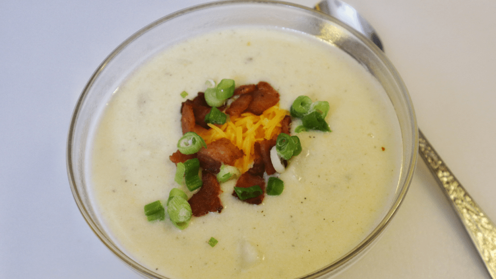 - Ladle the soup in a bowl and top with bacon and green onion…. and more cheese if you like. Eat and enjoy.