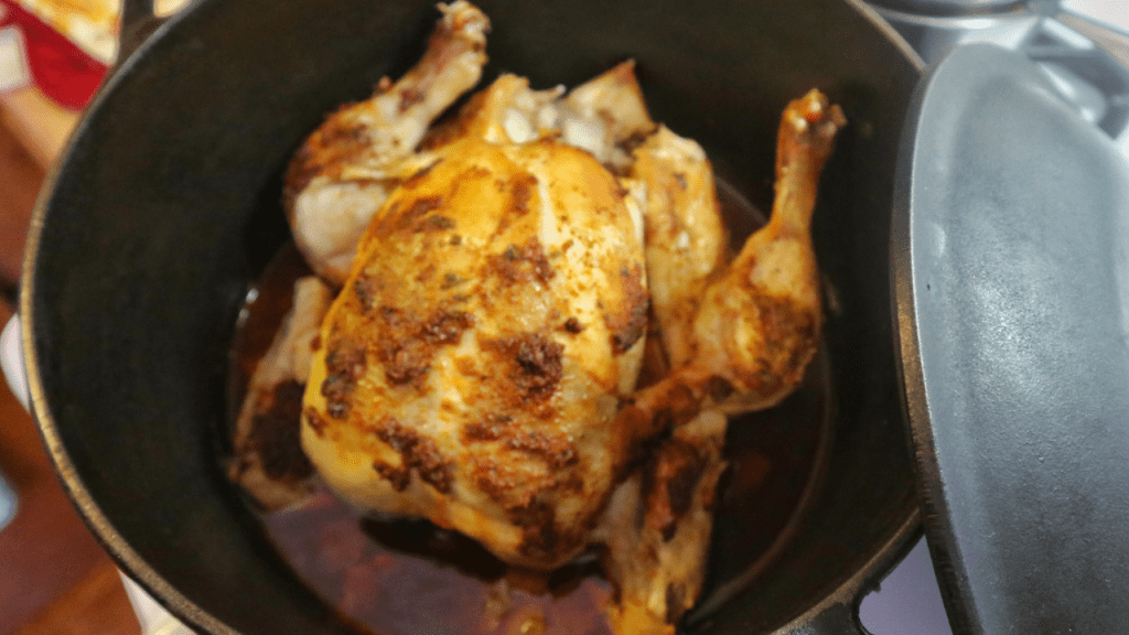 - If you are using a dutch oven remove the lid 10 minutes before being done to get the skin a bit more brown as the cooking process with a dutch oven browns the skin slightly in the process. You do not have to do this step at all if you do not want to.
