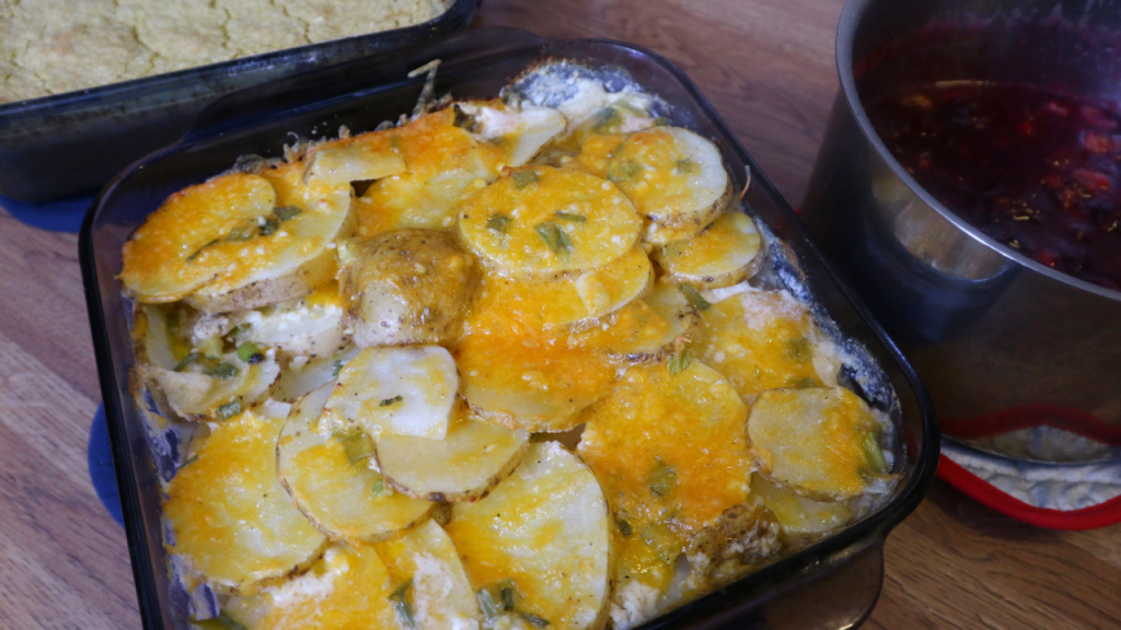 4 tbsp melted butter 4 large potatoes- sliced 1/4 inch thick 1 1/4 cup milk 3 tbsp flour 2 cloves garlic – minced 1 tsp salt 1/2 tsp pepper 1/4 tsp nutmeg 3 green onions – sliced 1 cup cheddar cheese – shredded