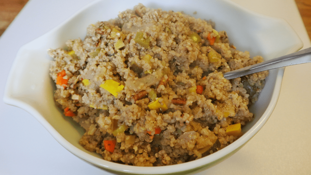 - Add a bit of oil to the base of the instant pot to prevent sticking. Add in all of your ingredients in no specific order. ( You can add the spinach and pecans last if you want as I do it either way) Give it a mix and attach the lid. Set to seal and set the manual button to 1 minute. After it cooks the 1 minute let it sit for about 10 to 15 minutes before releasing the pressure valve. Be careful as it is VERY HOT. Use a long handled spoon to release the valve. Give the mixture a fluff with the fork ( add in the spinach and pecans at this point if you didn’t earlier) and check for seasoning. Add more if needed and spoon into a serving dish and serve.