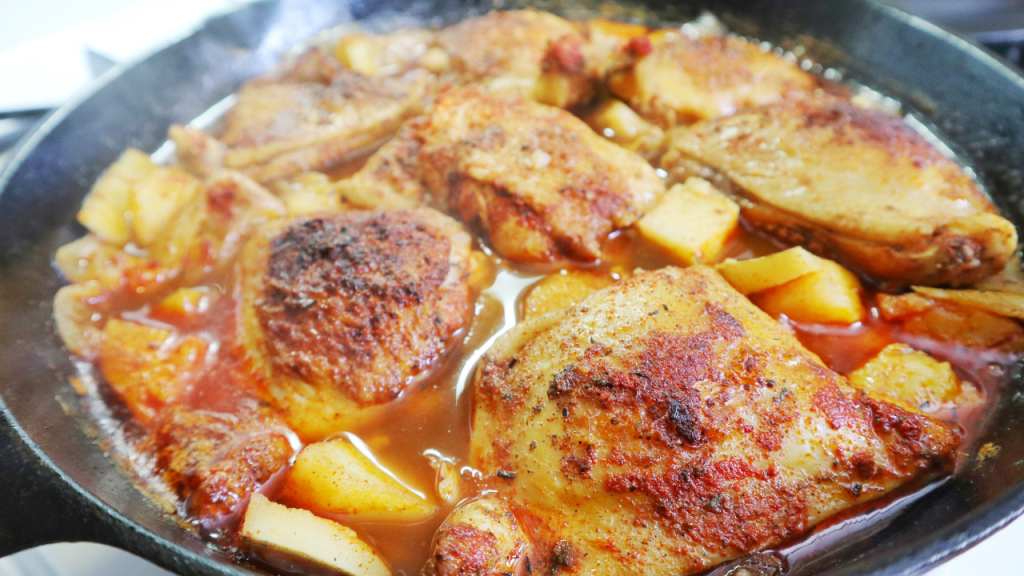 - In a large skillet (oven safe) or a dutch oven over medium heat add the oil and let the oil get hot. Add the chicken skin side down and sear on both sides. About 3 minutes per side or until nice and golden brown on both sides. They will continue to cook later in the oven.