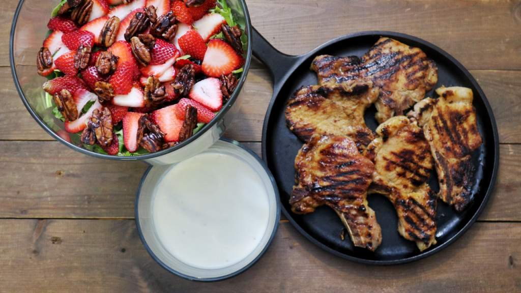 Easy Grilled Pork Chops With Strawberry Salad, Candied Pecans, And poppy seed dressing