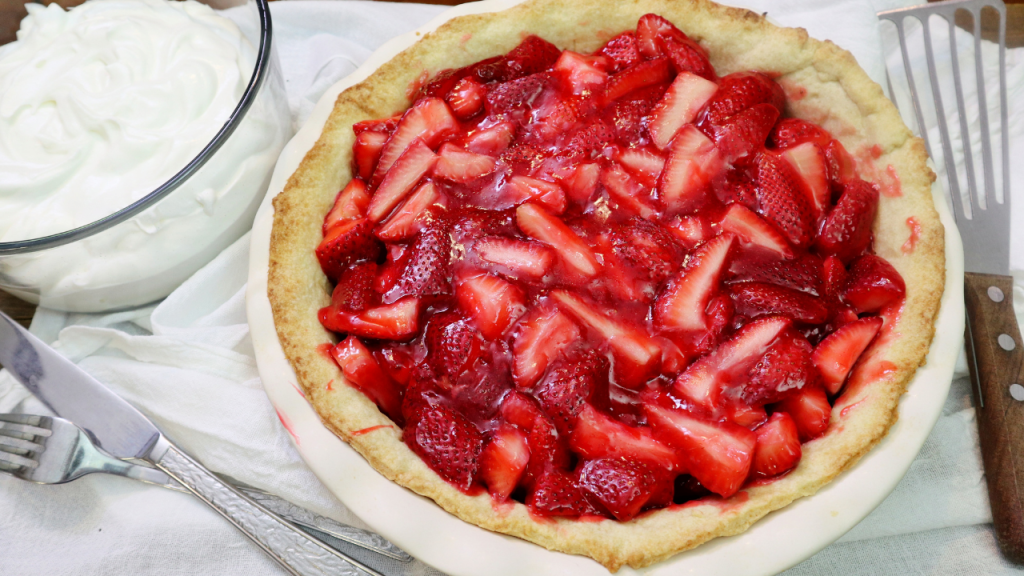 I remember making a similar pie with my grandmother when I was younger. She had huge strawberry plants in her back yard that we would pick strawberries from every summer. This pie is a lot more easier to make than what I grew up making but, it is just as good. I remember smashing the berries in a bowl to boil with gelatin to make this pie. I have made a shortcut to this pie that just doesn’t take quite as long.
