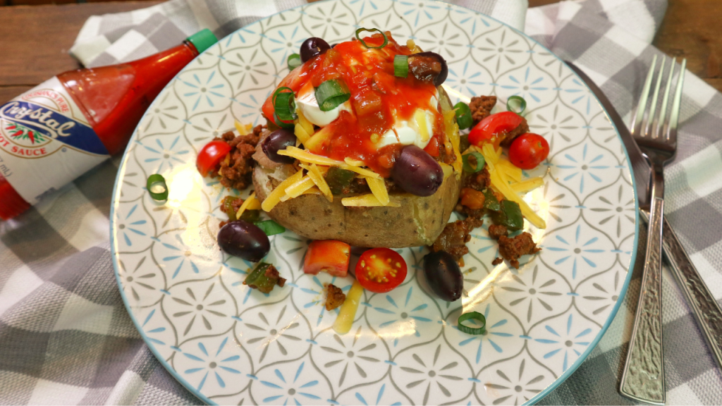 - TO ASSEMBLE- Place a cut baked potato on a plate, Add in the ground beef, and any of your favorite toppings that you like. (lettuce, tomato, olives, cheddar cheese, salsa, scallions, avocado/guacamole, sour cream, hot sauce, etc)