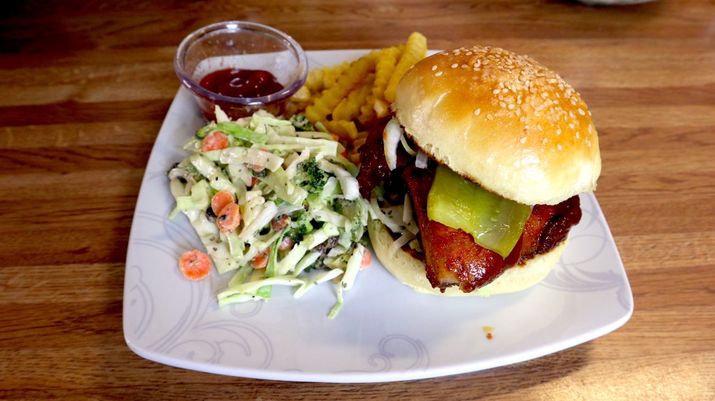 - Now you build your “burger” or “sandwich”. Here is how I assemble mine. To the bottom bun, I add a slight amount of mayo and then add a bit of slaw. Any kind of slaw will work for this. I then top that with a piece of rib followed by thinly sliced onion, extra BBQ sauce, and a pickle. I then top it off with the top bun. You can either place the slaw underneath the meat or on top of the rib meat. How you assemble it will work just fine. I also like to butter and toast the buns until golden brown in a dry skillet. It adds more flavor.