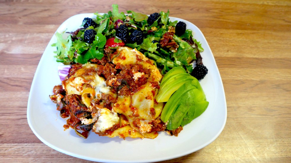 Ravioli Lasagna With Berry Salad And Avocado Everyone loves an easy throw-together meal and this recipe for "Ravioli Lasagna" is one recipe that I keep on hand for busy days. I can just make a quick meat sauce, layer everything together, and bake it off. I add a side salad to make a complete meal… Continue reading Ravioli Lasagna