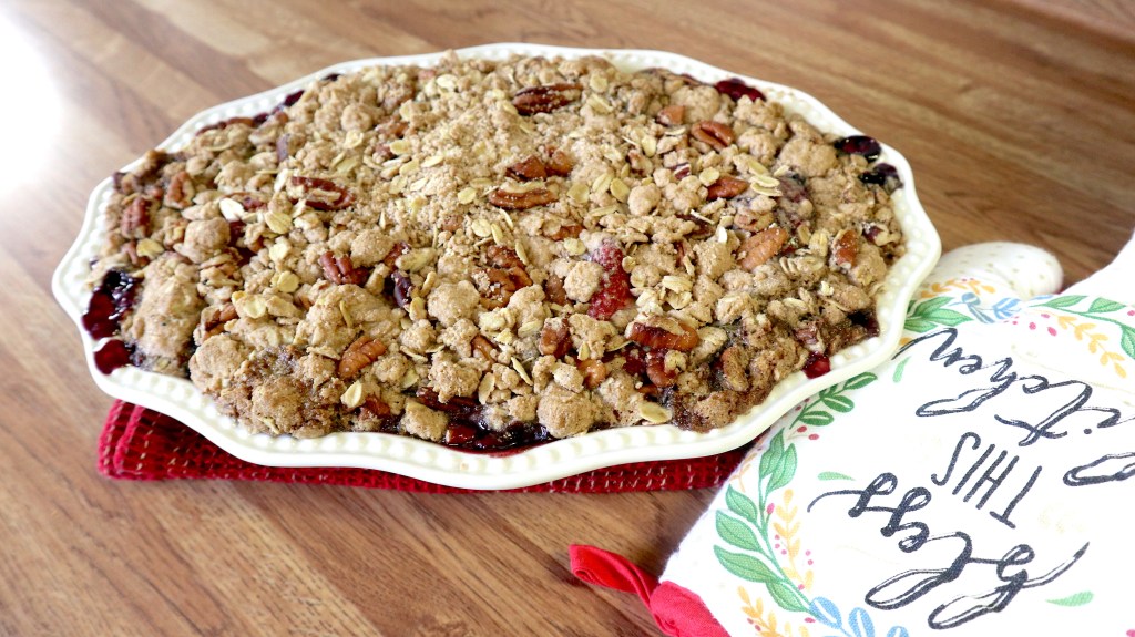 - Add the fruit mixture to the baking dish and spread it out evenly. Sprinkle the crumble topping over the fruit evenly making sure to cover the top.