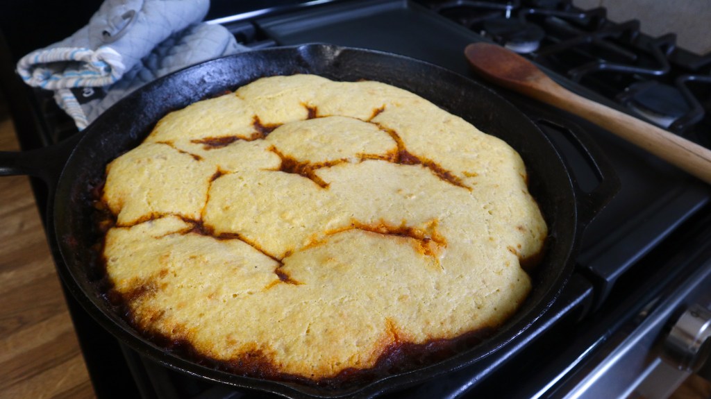 - Bake the chili for 17 to 20 minutes or until the cornbread topping is cooked through and golden brown. Remove and let stand 5-10 minutes before serving.
