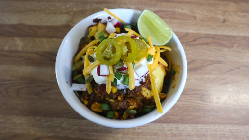 Chili is a dish that is hearty, filling, and can really stretch as a dinner. One pot of chili can last a few days and makes really good leftovers. In my opinion at least. I love making a huge pot of chili and freezing half of it for a later dinner. Although this is not a huge pot of chili this is just as delicious and definitely delicious.