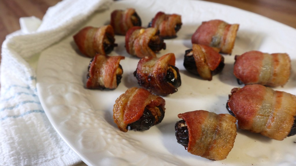 - Add a 1/2 piece of the pecan to the center of the date and 1 1/2 tsp of the cream cheese mixture. Gently press the date together. Wrap the date in the bacon half and place the seam side down on the sheet tray. You can use a toothpick to help them stay together if you need to.