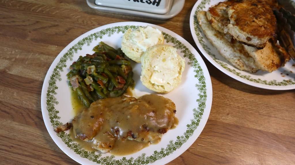 - My grandmother says to serve it with stewed apples, biscuits, and potatoes, but you can serve it with whatever you like. Sometimes I serve this with mashed potatoes, stewed potatoes, or rice. They all work well, so it just depends on what you want. I also love making some stewed green beans to go with this, as well as biscuits. You do you, and pair it with your family’s favorites.