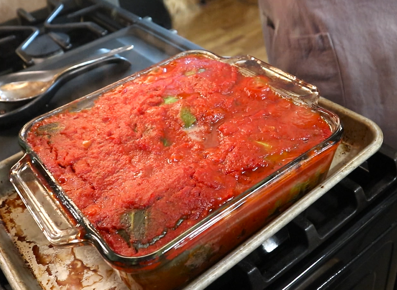 - Once all of the stuffed cabbage is rolled and placed in the pan, pour over the remaining pasta sauce. Spread the pasta sauce evenly over the stuffed cabbage.