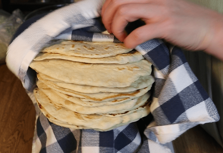 Tortillas are something I always have on hand. I make a big batch and keep them in the freezer. I pull them out when I want to use them. They thaw easily and keep very well. I will take out however many I need, let them sit on the counter for about 10 minutes, and then I just heat them up on the stove.